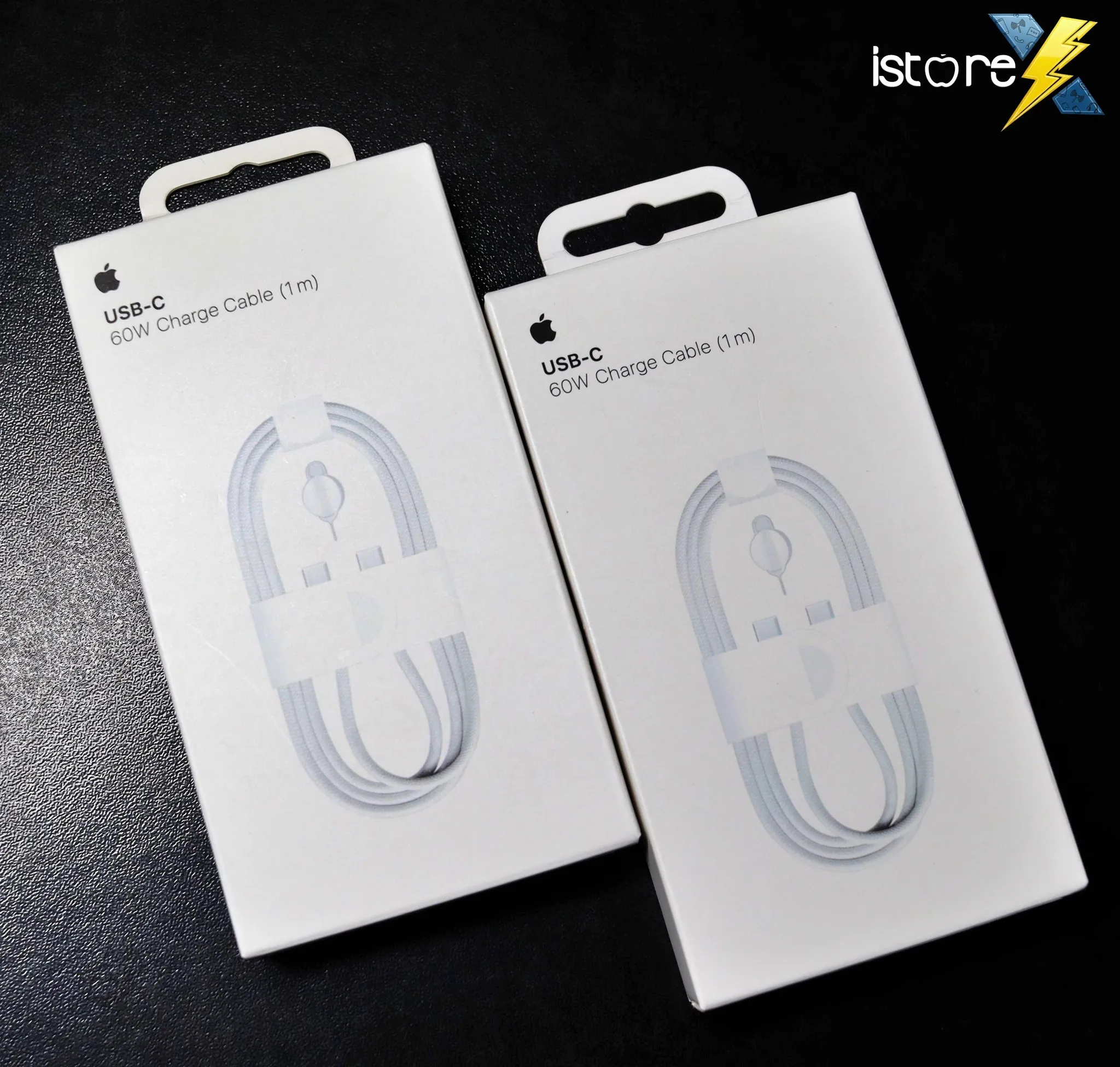 The official Apple 60W USB-C Charge Cable, each measuring 1 meter in length. The cables are presented in Apple’s signature minimalist white retail packaging, which features the iconic Apple logo and clean, modern typography.