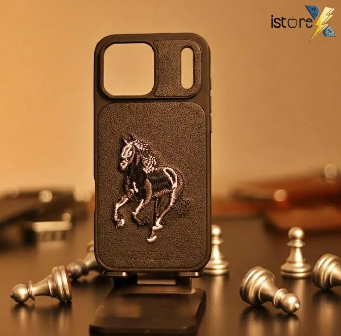 Designed for both style and protection, this case combines equestrian heritage with contemporary tech accessories. It’s presented against a minimalist grey background with a faint Apple logo watermark, emphasizing its purpose as a fashionable cover for an iPhone. The “istore” watermark in the corner suggests it may be sold through a third-party retailer or online store.